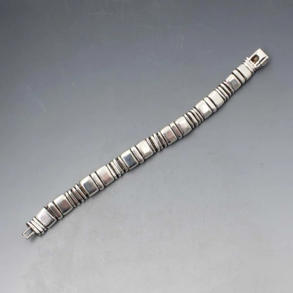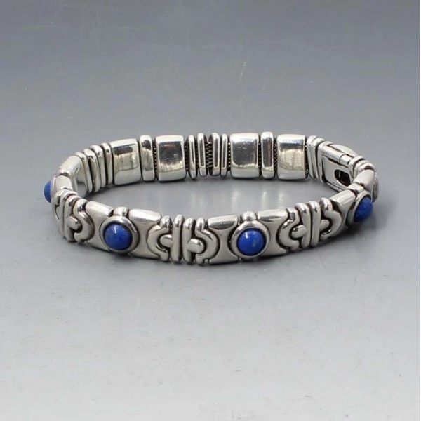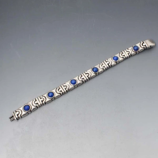 Beautiful vintage GARZI Italy, sterling silver and blue lapis lazuli bracelet. It has a sterling silver fold over clasp closure and is marked "GARZI" and "925 AR"on the rear. It measures approximately 7 inches (18 cm ) at full extension. Weight is 58 grams. It is in very good condition.Condition: Very goodColour/Gemstone: Lapis lazuli and silverMetal: Sterling SilverSize: 7.5 inches (18 cm)Era:
