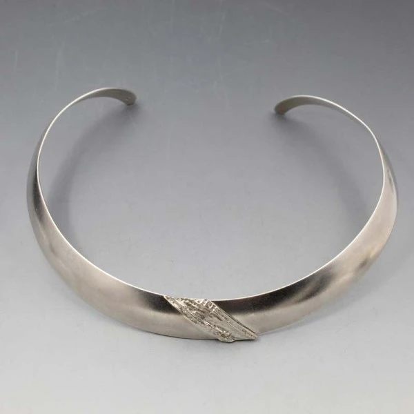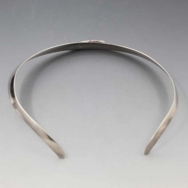 Vintage modernist slim sterling silver MEXICO collar necklace with slight hammered effect finish.The slim band measures approximately 0.5 cm in width. It is signed "MEXICO 925" on the rear as well as some indistinct numbers. The clear internal dimensions are approximately..