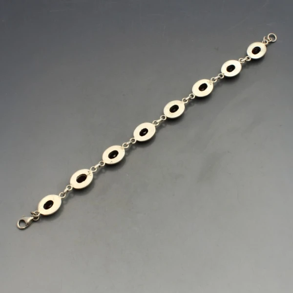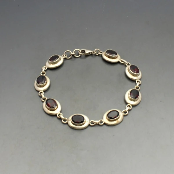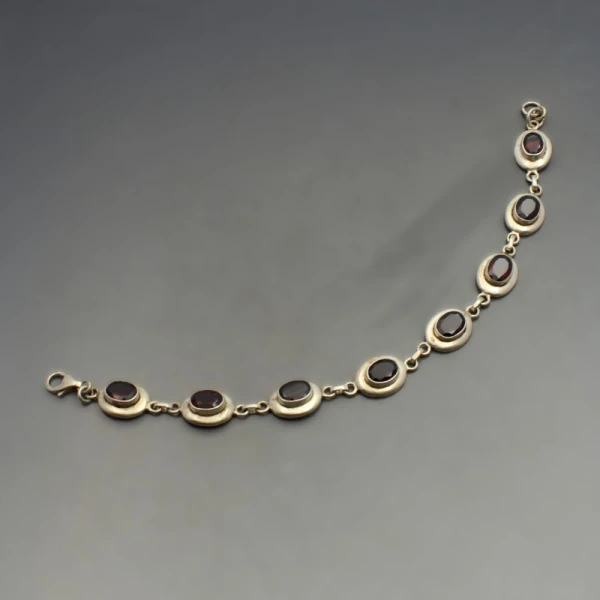 Vintage garnet and sterling silver ovals bracelet. The oval garnet gems are bezel set within open backed sterling silver settings. It measures approximately 18.5 (7.5 inches) long x 1 cm wide and has a silver lobster clasp closure. Weight is 16 grams. It is marked "925". It is in very good condition with small signs of wear commensurate with age