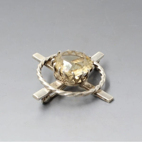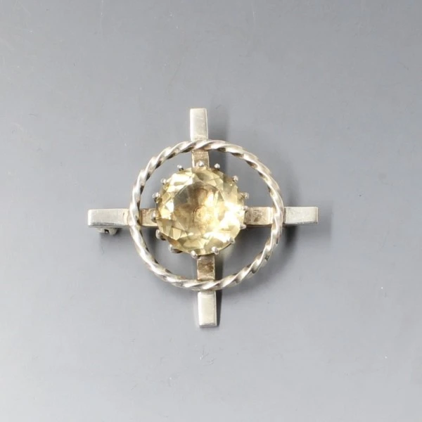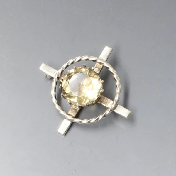 Vintage Glen Kelso Frame Scottish citrine and sterling silver brooch. The large faceted citrine gem is prong set in a deep sterling silver setting within a circle and cross type frame. . The brooch measures approximately 4 x 4 cm and has a pin and rollover C clasp closure to the rear. It is signed with makers marks "GF" and has silver hallmarks for Edinburgh 1971 on the rear. Weight is 9 grams. It is in very good condition with small signs of wear commensurate with age.