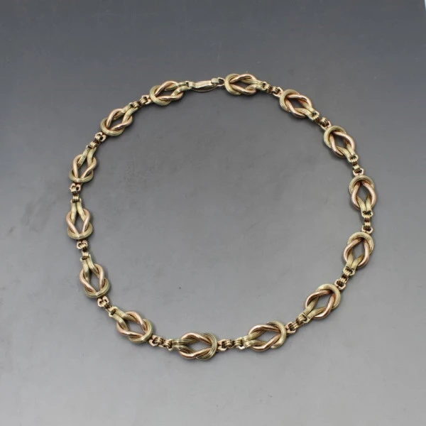 Vintage 12 carat gold plated sterling silver chain necklace. The necklace has a decorative rope chain type design with a flat oval hook clasp closure. It is marked "1/20 12K on Sterling". It measures approximately 15 inches (39 cm). Weight is 49 grams. It is in very good condition . Estimated to date from 1960's to 1980's.