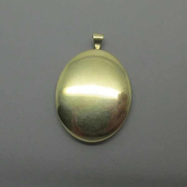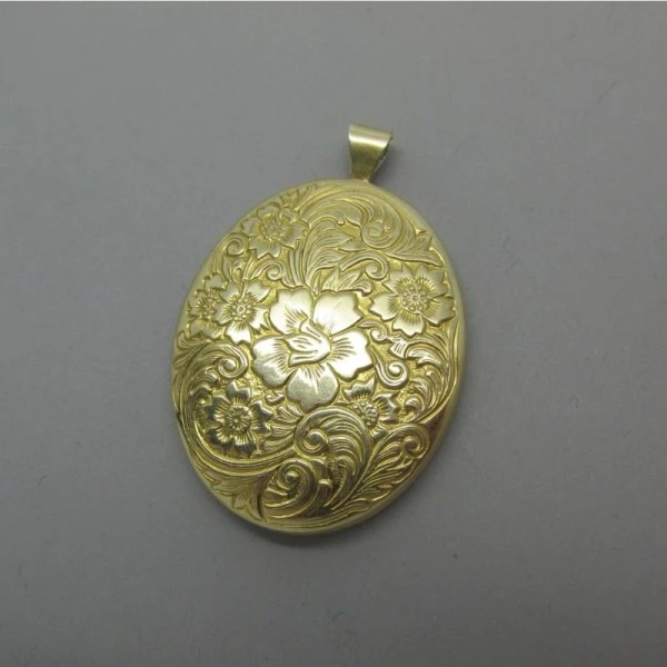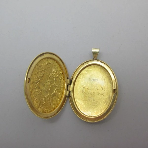 Beautiful quality 9 carat gold plated vintage sterling silver locket in very good condition. The locket has an oval shape with floral type details engraved on the front . It is openable and measures approximately 3.3 x 2.7 cm wide not including the pendant bail. It is marked as 925 and 9 crt bonded gold on the inside of the locket. The locket is very good condition.