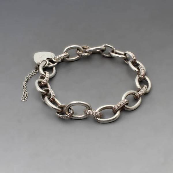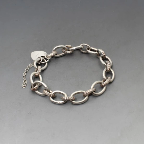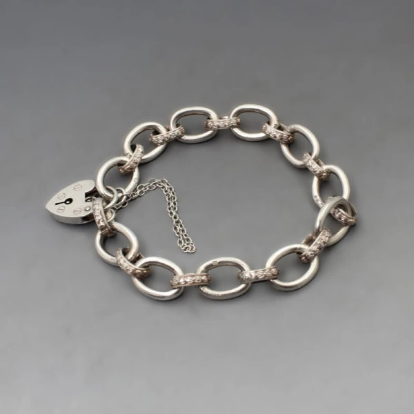 Vintage Graham Watling of Lacock sterling silver chain bracelet with heart lock detail. The bracelet has silver oval links with smaller silver oval links in between set with tiny diamante crystals. The bracelet measures approximately 18 cm long x 1 cm wide and has a silver heart lock. It is marked "SILVER" on the lock and also has makers marks "GW" and silver hallmarks for London 1975 on one of the links .Weight is 24 grams. It is in very good condition. Condition: Very Good Colour/Gemstone: Silver Metal: Sterling silver Size: Approximately 18 cm long (7 inches) x 1 cm wide Weight: 24 grams Era: 1975