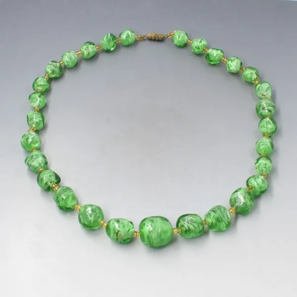 Lovely vintage set of Venetian green glass lamp work beads with a barrel clasp closure. The set measures approximately 49 cm (19 inches ) long. Weight is 80 grams. The green beads are irregular shaped and graduated in size, with the largest bead measuring approximately 1.9 x 1.8 cm . Small yellow glass beads separate the larger green beads. The necklace is in very good condition. Estimated to date from 1940's to 1960's.