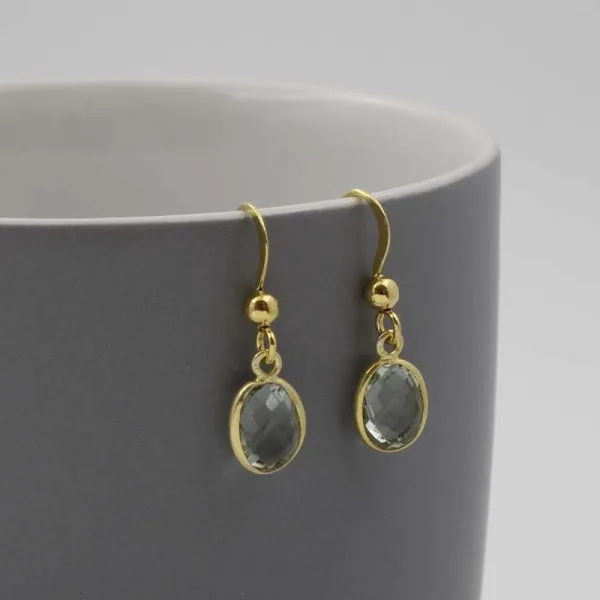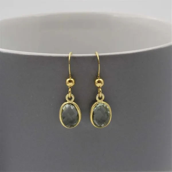 Simple oval shaped faceted green amethyst gems bezel set in gold vermeil settings with gold vermeil ear wires. The green amethyst ovals measure approximately 0.9 x 0.6 cm. The earring drop length (from the highest point of the earwire) is approximately 2.3 cm.