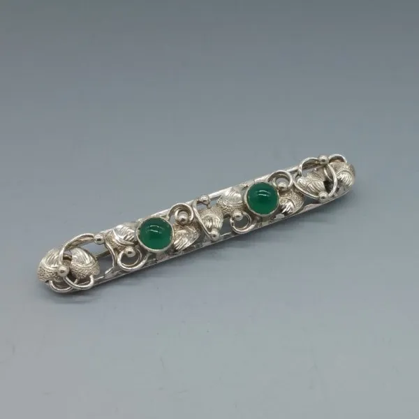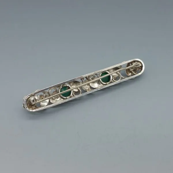 Pretty vintage silver and green chrysoprase brooch.The chrysoprasegems are bezel set in detailed floral silver settings.The rear of the brooch has a pin and C type rollover closure. The brooch measures approximately 5.2 X 0.9 cm long . Weight is 7.5 grams. It is in very good condition.