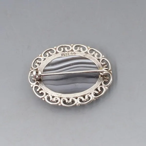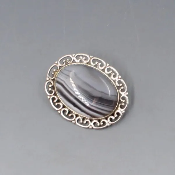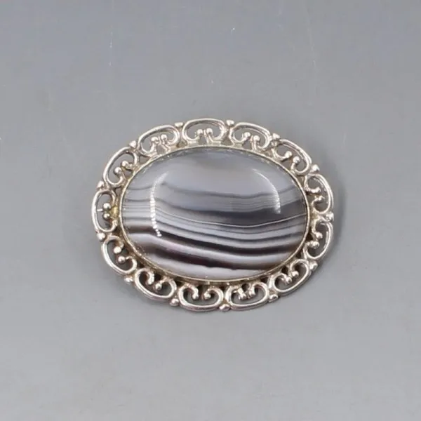 Vintage agate and sterling silver brooch .The oval grey agate cabochon is bezel set in a decorative sterling silver setting. It has a pin and rollover C clasp closure to the rear. It is signed " N B 925 S " on the rear. The brooch measures approximately 3.2 cm x 2.5 cm. Weight is 7 grams. It is in very good condition