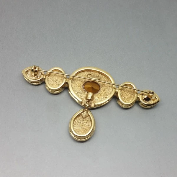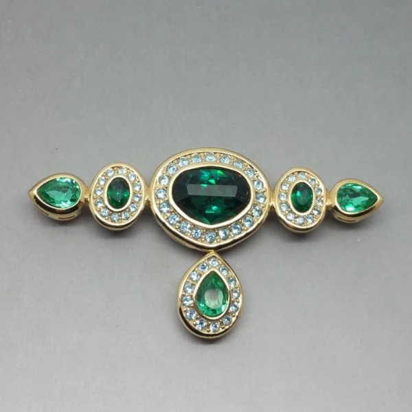 Beautiful quality sparkling Grosse green crystal and gold tone brooch. The rear of the brooch has a gold tone finish with a rollover C clasp pin closure.. It is signed with " GROSSE" . The brooch measures approximately 7 cm X 3.5 cm long drop section. It is in excellent unworn condition.