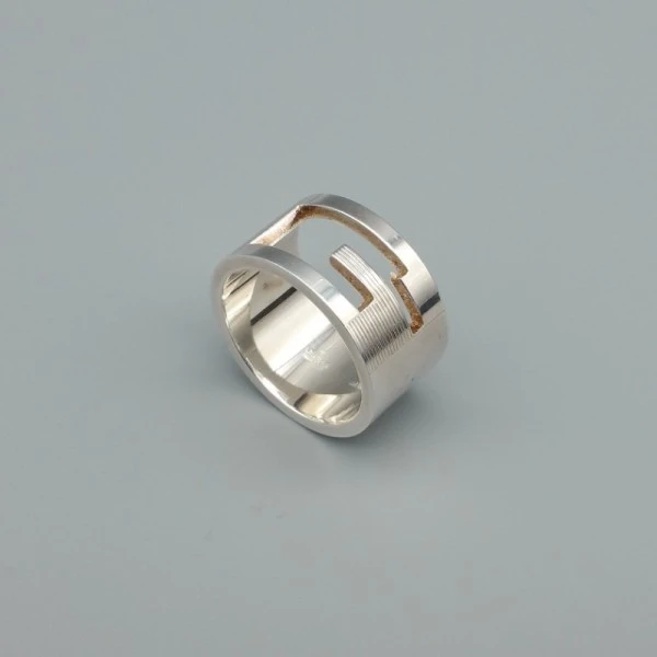 Stylish vintage Gucci wide sterling silver unisex ring. It is signed "R Gucci Made in Italy" and has silver hallmarks on the inner part. The ring is approximately a UK ladies size P or P1/2. It is in very good condition and comes with the original brown Gucci box.