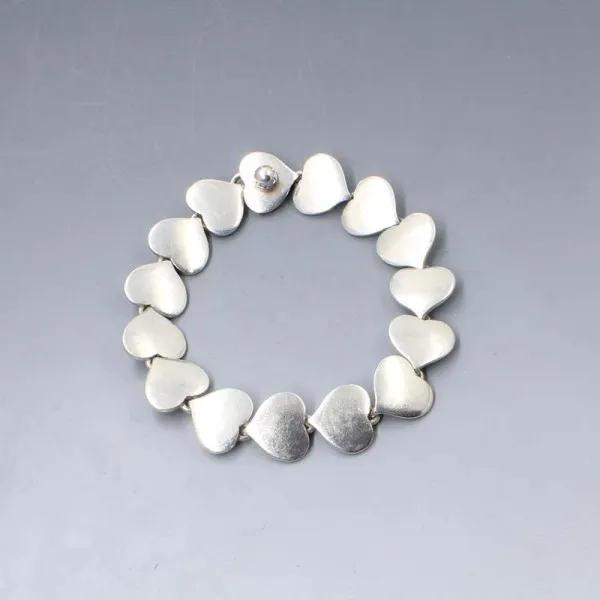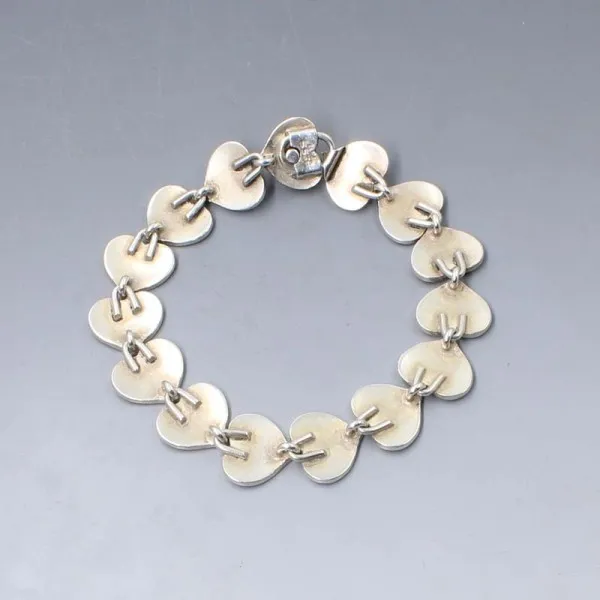 Beautiful vintage Hans Hans, Denmark,1940's modernist sterling silver hearts bracelet. It has sterling silver heart shaped silver links and a unique screw clasp closure. It is signed " 925S Ha H ". The bracelet measures approximately 18 cm (7 inches) long. Weight is 28 grams. It is in very good condition.