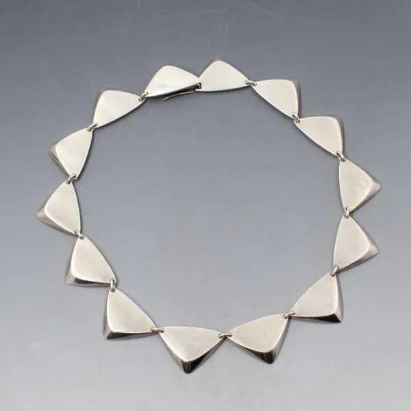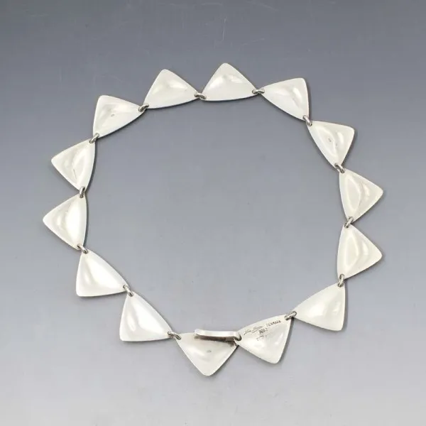 Beautiful and rare Hans Hansen, Denmark, sterling silver modernist triangle necklace. It was designed for Hans Hansen by Bent Gabrielsen and has 14 silver triangle shaped links and a hook type clasp closure. It is signed "Hans Hansen, 925S Denmark 925". It also has silver import hallmarks for London 1970 and sponsors marks "DSD" for "Danish Silver Design" .The necklace measures approximately 15 inches (38 cm). Weight is 73.2 grams. It is in very good condition with small signs of wear commensurate with age.