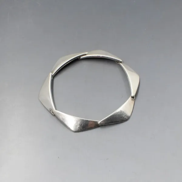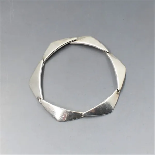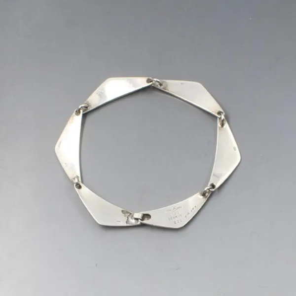 Vintage Hans Hans Denmark, modernist sterling silver "Peak" bracelet design #238 . It was designed for Hans Hansen by Bent Gabrielsen in 1958. It has a 6 silver links and a hook type clasp closure.It is signed "Hans Hansen, 925S Denmark 238". The bracelet measures approximately 18 cm (7 inches) long. It is in very good condition. Weight is 16 grams.