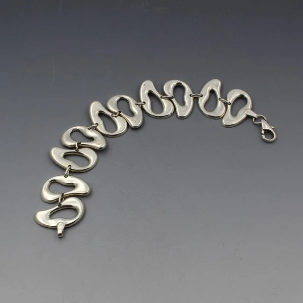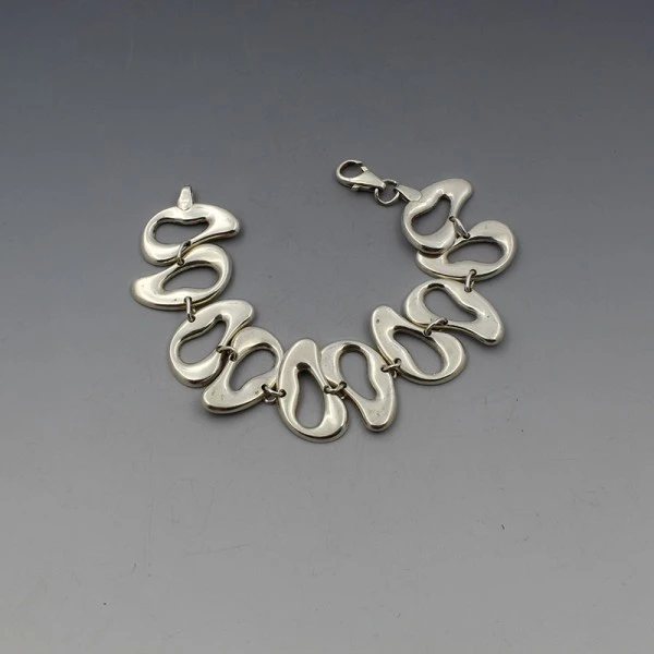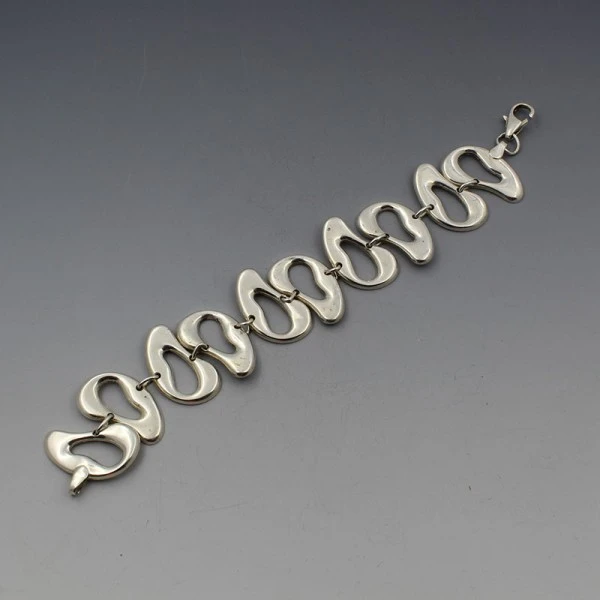 Beautiful vintage designer sterling silver modernist necklace with silver leaves design. The necklace measures approximately 16 inches (41 cm) long x 1.3 cm wide (at the widest part) and has a lobster clasp closure. Weight is 31 grams. The necklace is marked "925" and has indistinct makers mar..
