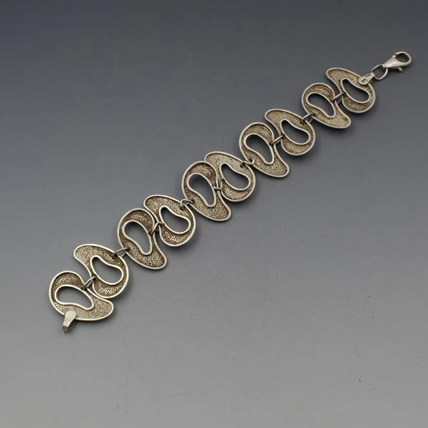 Vintage Hans Julius Larsen, Denmark 830 silver art nouveau style necklace. The necklace has a series of floral art nouveau style links and an 830 silver hook clasp closure. It is signed with makers marks "JL" and "830S". It measures approximately 16.5 inches (42 cm). Weight is 43 gra..