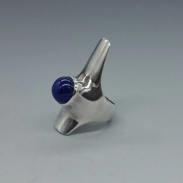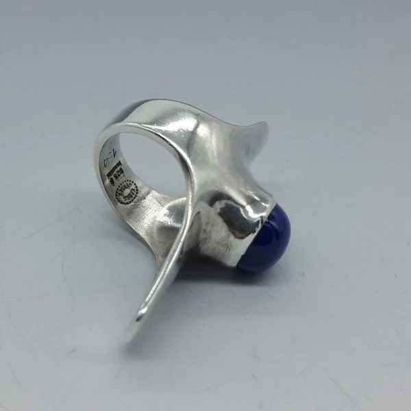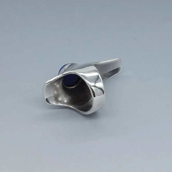 A beautiful rare Georg Jensen vintage modernist sterling silver ring with blue lapis lazuli stone designed by Henning Koppel. The inside of the ring is marked with "GEORG JENSEN 925 DENMARK 154" . It is approximately a UK ring size K or K 1/2 . It is in very good condition. Weight is 12.4 grams. It is estimated to date from the 1960's. A similar example can be seen in the Janet Drucker reference book on Georg Jensen. George Jensen was a renowned silversmith and the Georg Jensen brand has come to represent excellent quality craftsmanship and design. Henning Koppel was one of the most renowned designers who worked with the Georg Jensen Company. His designs have a clean, modern, sculptural feel. This ring is a lovely example of his work.