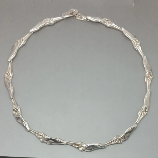 Beautiful vintage designer sterling silver modernist necklace with silver leaves design. The necklace measures approximately 16 inches (41 cm) long x 1.3 cm wide (at the widest part) and has a lobster clasp closure. Weight is 31 grams. The necklace is marked "925" and has indistinct makers mar..