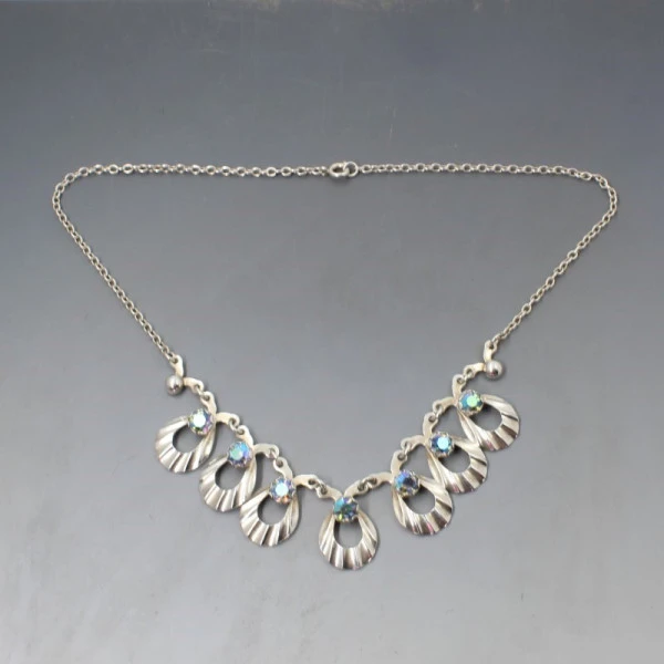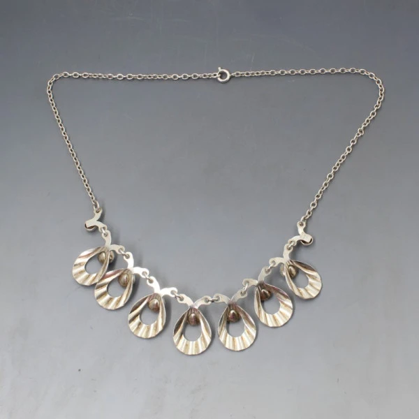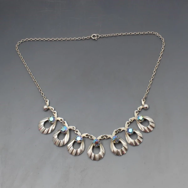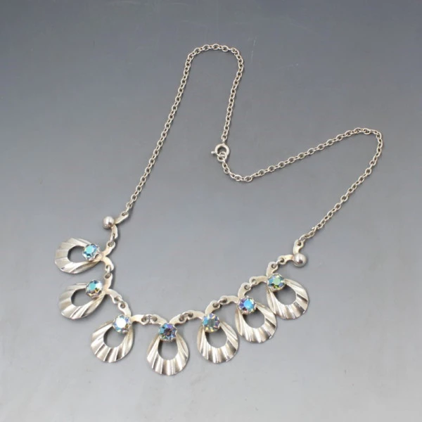 Hermann Siersbol, Denmark vintage sterling silver floral necklace. The necklace is signed "STERLING DENMARK HS " on the rear. Each silver eclipse shaped "petal" measures approximately 1.8 x 1.5 cm and features a blue glass crystal within a silver setting. It has a 15.75 inch (40 cm) sterling silver chain with spring ring clasp closure. Weight is 14.4 grams. It is in very good condition and is estimated to date from the 1950's to 1960's. Condition: Very good Colour: Silver and blue crystal Metal: Sterling Silver Size:15.75 inch (40 cm) chain approximately Era: 1950's to 1960's