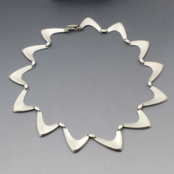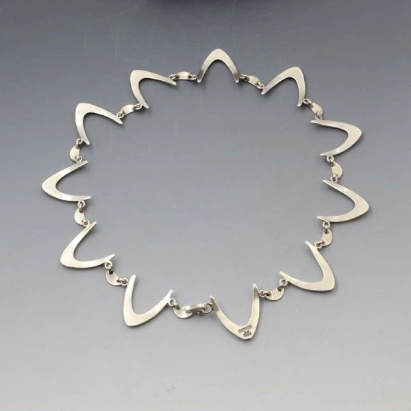 Beautiful rare Herman Siersbol, Denmark, sterling silver modernist boomerang style links necklace. It has a toggle clasp type closure and measures approximately 39.5 cm (15.5 inches). Weight is 43.3 grams. It is signed "925 HS" on the clasp. It is in very good condition and is estimated to date from the 1950'S.