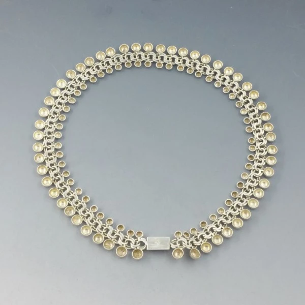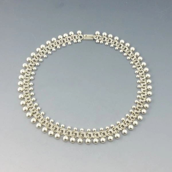 Beautiful and rare Herman Siersbol, Denmark, 830 silver modernist choker style necklace. It has a detailed design with small silver half ball details running alongside each side of a central chain link area. The necklace measures approximately 15 inches, (38 cm) and has a silver box clasp closure. Weight is 38.3 grams. It is signed " HS 830 S" on the clasp. It is in very good condition.