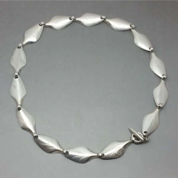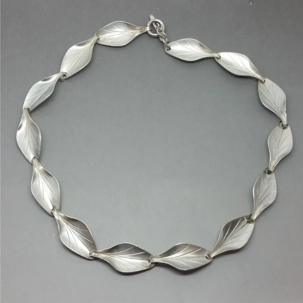 Elegant Danish Hermann Siersbol sterling silver leaf necklace, It has a series of delicately detailed leaf shaped links and a toggle clasp closure.The necklace is signed "STERLING 925 DENMARK HS ". It measures approximately 15.2 inches (38.6 cm) It is in very good condition and is estimated to date from the 1970's Condition: Very good Colour: Silver Metal: Sterling Silver Size: 15.2 inches (38.6 cm) chain approximately Era: 1970's