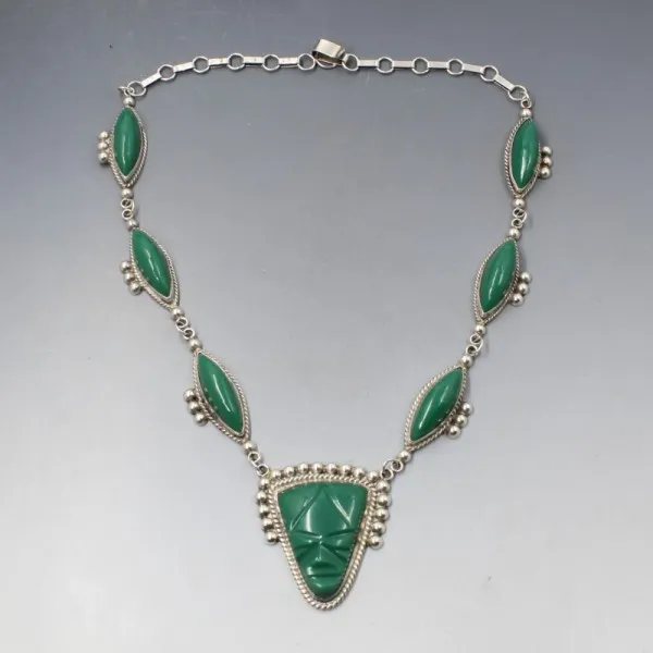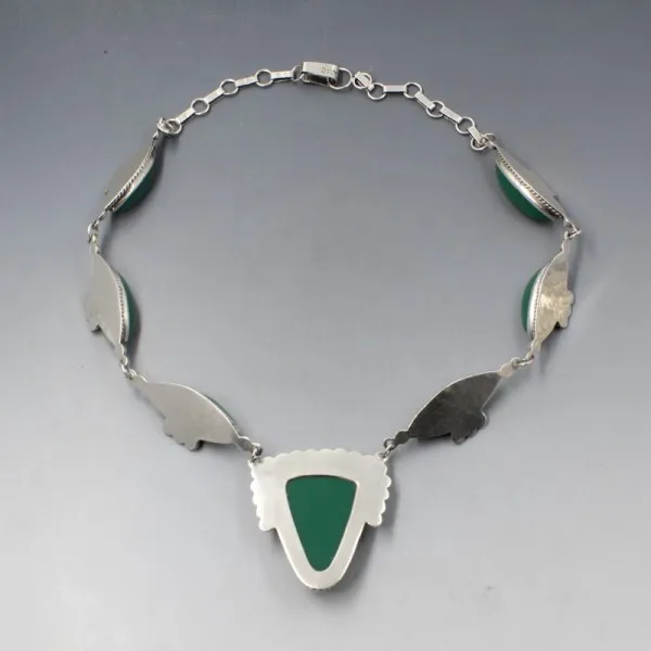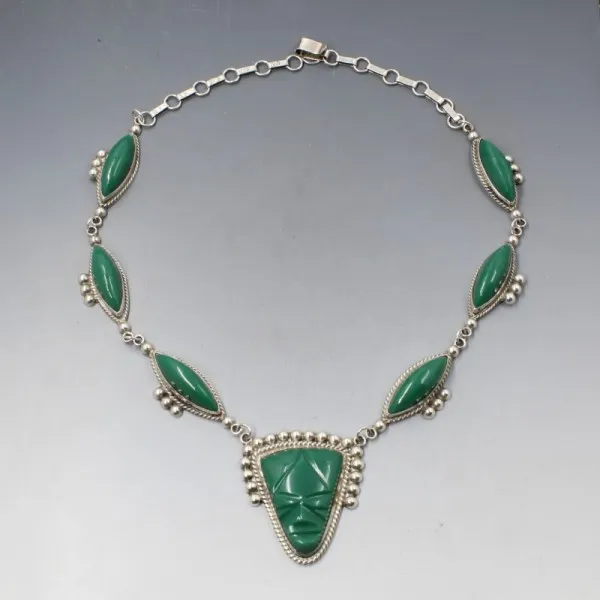 Beautiful vintage Mexican green jade and sterling silver necklace. The necklace has a jade warrier mask focal point with and a series of eclipse shaped jade cabochons all bezel set in decorative solid silver settings. The necklace has a sterling silver chain with hook clasp closure. It measures approximately 18 inches (46 cm). The jade mask section measures approximately 4.2 x 3.7 cm. Weight is 51 grams. It is signed "STERLING MEXICO" on the clasp The necklace is in very good condition. Estimated to date from 1950's to 1970's.