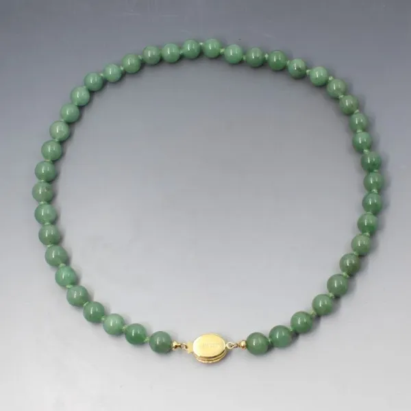 Lovely set of jade beads with decorative jade and 800 silver gold plated box clasp.The length of the beads is approximately 20 inches (51 cm), and the beads are hand knotted in between each bead. The clasp is marked "800" and "JS.RSM." on the rear. Weight is 66 grams. They set is in very very good condition. Condition: Very good Colour/Gemstone: Jade Metal:800 silver clasp with gold plating Size: Approximately 20 inches (51 cm) Era: Estimated 1970's to 1980's