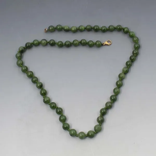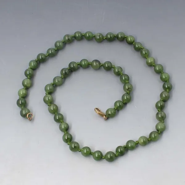Lovely set of vintage round shaped jade beads with gold tone lobster clasp closure. The set measures approximately 51 cm (20 inches). The beads are hand knotted in between each bead and each measure approximately 0.8 cm in diameter. Weight is 42 grams.They are in very good condition.