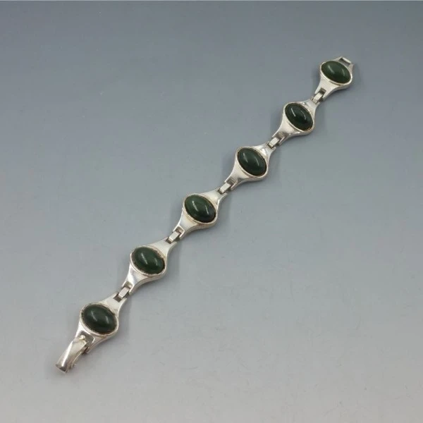 Beautiful sterling silver bracelet with oval jade cabochons bezel set in sterling silver settings. It has a foldover clasp closure and is marked 925 on the rear. The bracelet measures approximately 16 cm (6.5 inches). Weight is 19.8 grams. It is in very good vintage condition.