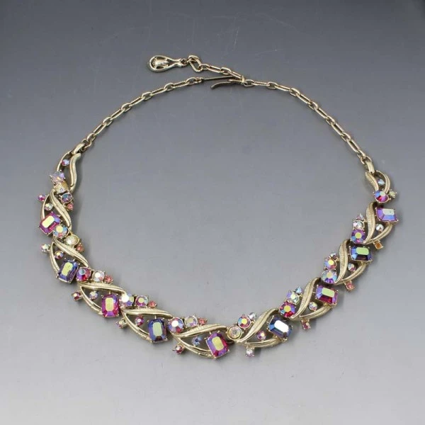 Condition: Very good condition with small signs of wear commensurate with age Colour/Gemstone:Mixed pink, purple and aurora borealis crystals Metal: Gold Tone Size: 17 inches (43 cm) Era: 1950's
