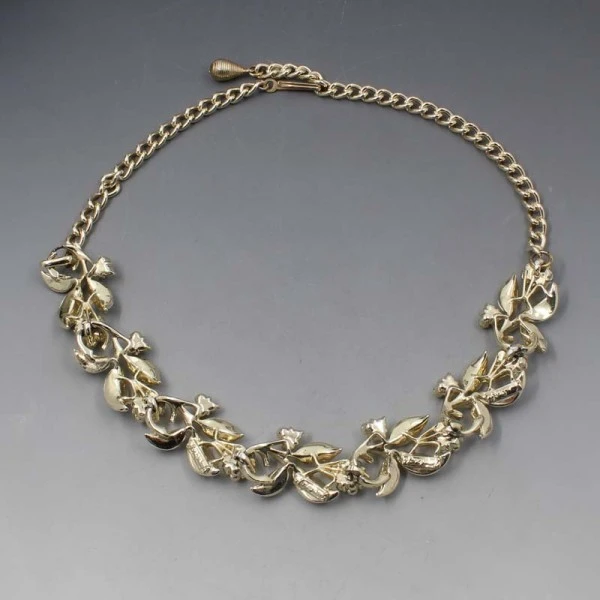Beautiful vintage designer sterling silver modernist necklace with silver leaves design. The necklace measures approximately 16 inches (41 cm) long x 1.3 cm wide (at the widest part) and has a lobster clasp closure. Weight is 31 grams. The necklace is marked "925" and has indistinct makers mar..