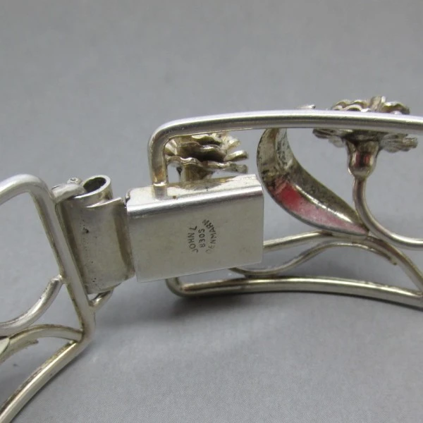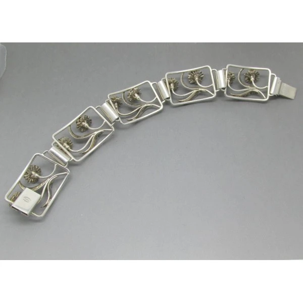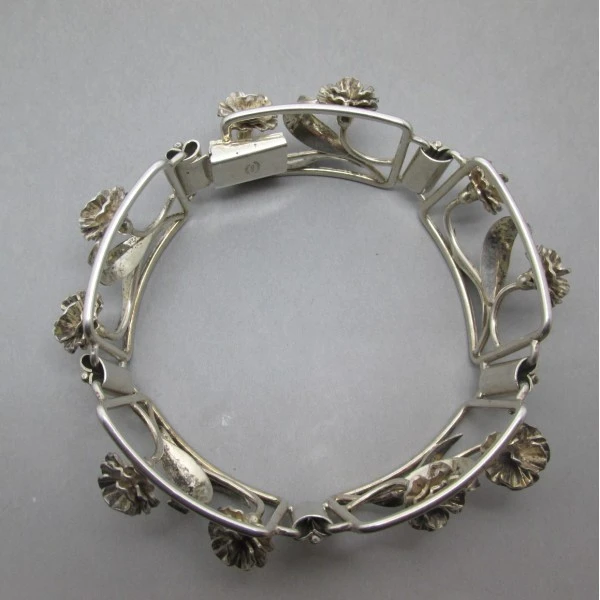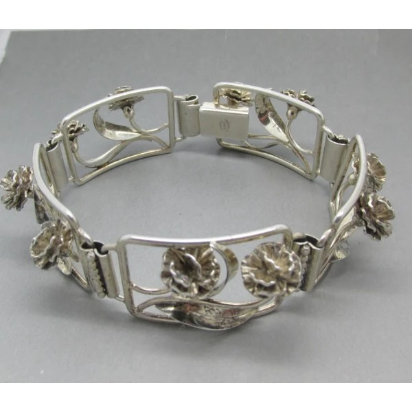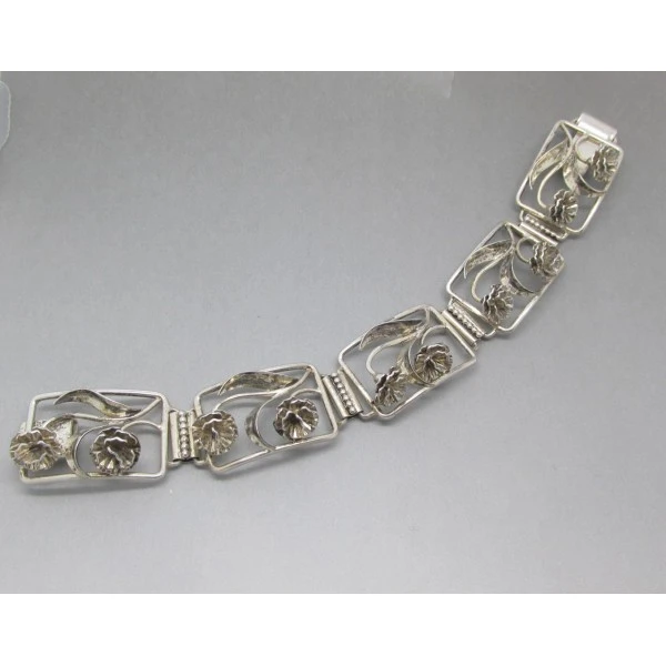 Lovely and detailed John Lauritzen of Denmark silver link bracelet. It comprises a flower and leaf design in each of the 5 links with wide adjoining links.It is marked "JOHNL 830S DENMARK". 830 is a Scandinavian standard of silver used until the 1970's. It is estimated to date from the 1950's to 1960's. It measures approximately 7 inches (17.8cm) and weighs 34.3 grams. It is finished with a box clasp closure and is in very good vintage condition