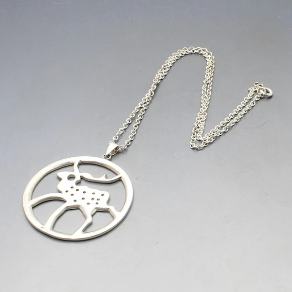Rare vintage Frank + Regine Juhls, Norway, stylised silver reindeer pendant. The pendant measures approximately 4.8 cm in diameter and has a silver pendant bail and 19 inch (48 cm) sterling silver chain. Weight is 22 grams. It is signed with makers marks "JUHLS KAUTOKEIN 925S" on the rear. The pendant is in very good condition with small signs of wear commensurate with age. Condition: Very Good Colour/Sterling silver Size: 4.8 cm diameter with 19 inch chain Weight: 22 grams Era: Estimated 1970's
