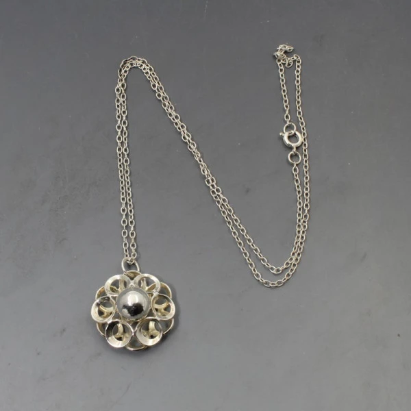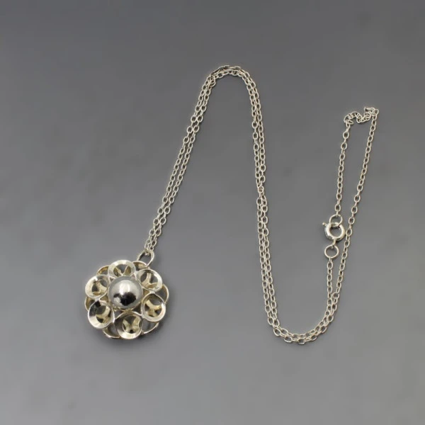 Vintage Kultaseppa Salovaara, Finland, sterling silver flower design pendant. It has the Kultaseppa "polar bear" makers mark , and "925 FINLAND" marks. The pendant measures approximately 2.3 cm in diameter. It has a 17 inch (43) silver chain with spring ring clasp closure. Weight is 4 grams. It is in very good condition.