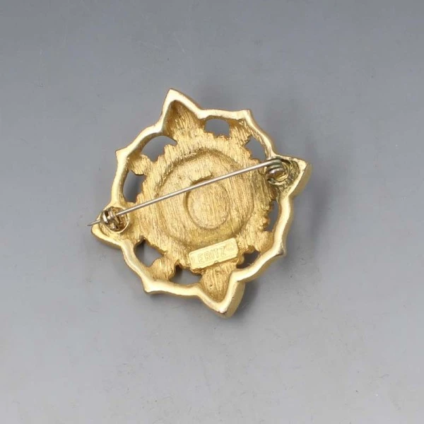 Pretty LERITZ costume brooch. It has faux amber glass cabochons set in a decorative gold tone setting .It has a pin and rollover C clasp closure to the rear. It is signed "LERITZ" on the rear. The brooch measures approximately 4.8 cm x 4.3 cm. Weight is 25 grams. It is in very good condition.