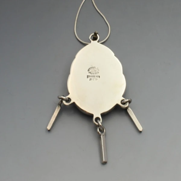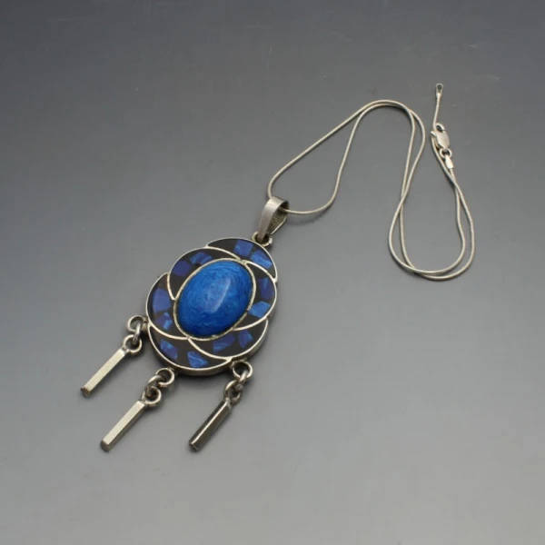 Vintage Mexico quality lapis lazuli and sterling silver pendant. The pendant has a large central oval shaped blue lapis lazuli cabochon within a decorative lapis lazuli and black enamel surround , bezel set within a sterling silver setting. It has three sterling silver drops , and a silver pendant bail and chain. The pendant measures approximately 7 x 3.4 cm (not including the bail). The sterling silver chain measures approximately 40.5 cm (16 inches) approximately. The pendant is marked "HECHO EN MEXICO STERLING 925" on the rear. Weight is 27 grams. It is in very good condition