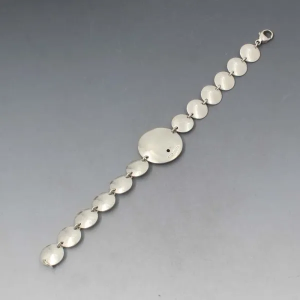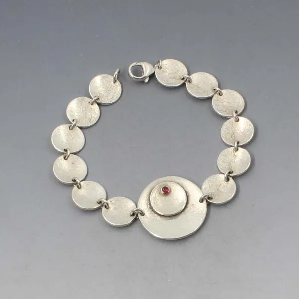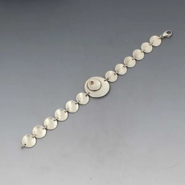 Vintage designer handmade silver bracelet. The disc shaped sterling silver links have a slight textured effect. The large central silver disc has a tiny red garnet gem.The rear of the bracelet has a smooth silver finish and is marked " W & GS" and has silver hallmarks for London 2009. Weight is 20.2 grams. It measures approximately 18.5 cm long. It is in very good condition.