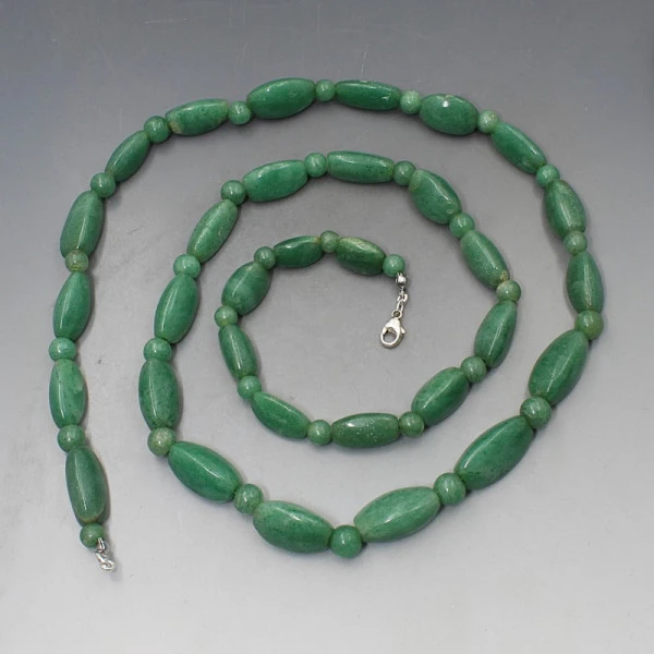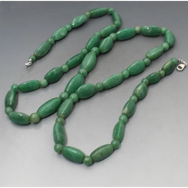 Lovely long set of vintage green jade beads. The set has a mixture of long oval and round shaped jade beads and measures approximately 34 inches (87 cm). The oval jade beads measure approximately 2 x 1 cm. The vintage jade beads have been restrung and have a new sterling silver lobster clasp closure. Weight is 116 grams. The necklace is in very good condition .