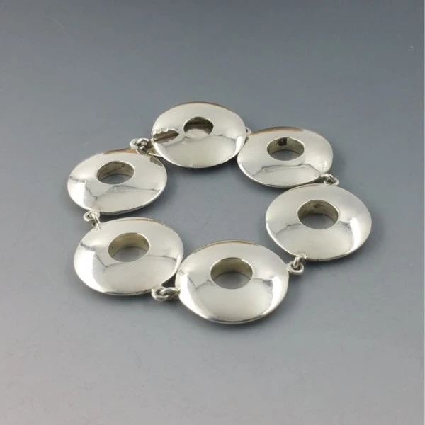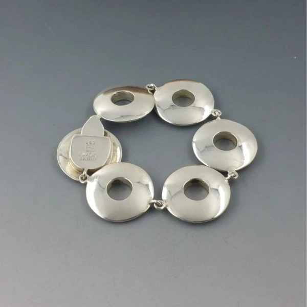 Los Ballesteros vintage solid sterling silver Mexico bracelet. It has 5 solid circular shaped disc links and a box clasp closure.The rear of the bracelet is signed "MEXICO TS - 79 925" and has the "Los Ballesteros" signature and makers mark. It measures approximately 8 inches (20 cm ). Weight is 49.5 grams. It is in very good condition. Condition: Very good Colour/Gemstone: Silver Metal: Sterling Silver Size: 8 inches (20 cm) Era: