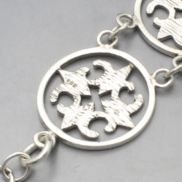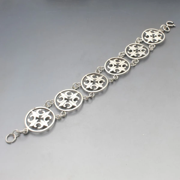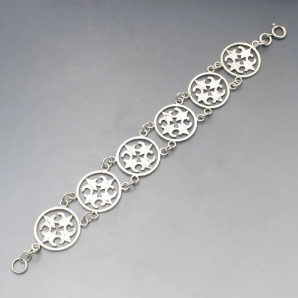 Vintage Malcolm Gray, Ortak sterling silver St Magnus cross bracelet. It has a series of sterling silver round shaped St Magnus cross design links and a sterling silver spring ring clasp closure. The bracelet measures approximately 20.5 cm long (8 inches) x 2.4 cm wide. Weight is 26 grams. It is signed with makers marks "MG" and has silver hallmarks for Edinburgh 1977. It is in very good condition with small signs of wear commensurate with age