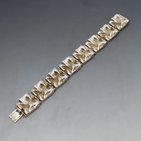Beautiful vintage modernist Matti J. Hyvarinen, Finland, sterling silver bracelet. It is a solid heavy silver link bracelet with a textured finish to the links. It has a flat box clasp closure and measures approximately 18.5 cm (7 inches) x 2 cm. Weight is 73 grams. It is signed with the makers marks "MJH" and "925 V7 MADE IN FINLAND". It is in very good condition. It is estimated to date from the 1970's.