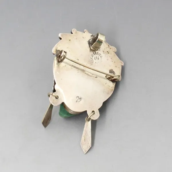 Vintage Mexican jade and sterling silver warrior face mask brooch or pendant. The carved jade stone is set in a decorative sterling silver mask setting It has a pin and rollover C clasp closure to the rear and a pendant bail. It is signed "MEXICO 925 TAXCO " on the rear and has other indistinct makers marks. The brooch measures approximately 4.5 cm x 3.7 cm (not including the dangle earring details on the mask). Weight is 22 grams. Estimated to date from the 1950's to 1960's. It is in very good condition with small signs of wear commensurate with age.