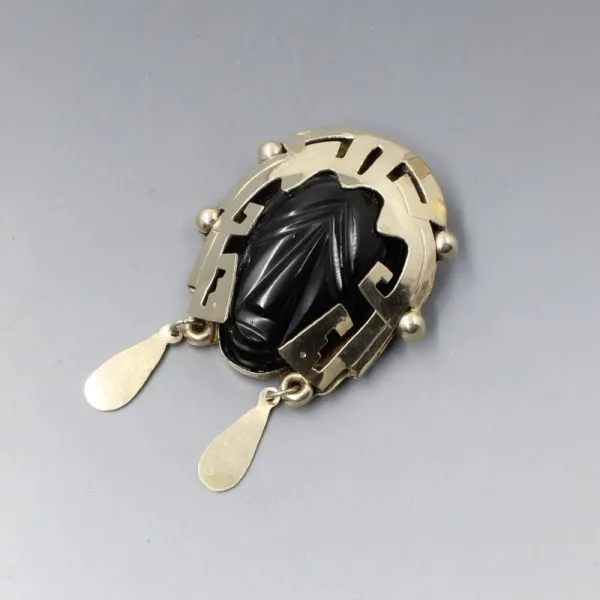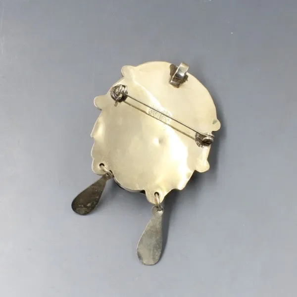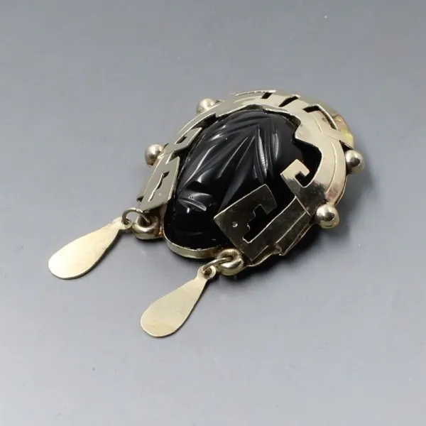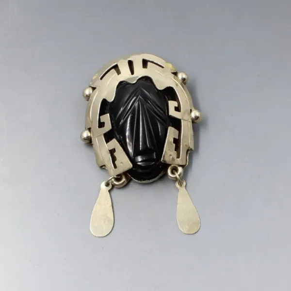 Vintage Mexican onyx and sterling silver warrior face mask brooch or pendant. The carved onyx stone is set in a decorative sterling silver mask setting. It has a pin and rollover C clasp closure to the rear and a pendant bail. It is signed "HECHO EN MEXICO " on the rear .The brooch measures approximately 4.9 cm x 4.4 cm (not including the dangle earring details on the mask). Weight is 27 grams. Estimated to date from the 1950's to 1960's. It is in very good condition with small signs of wear commensurate with age.