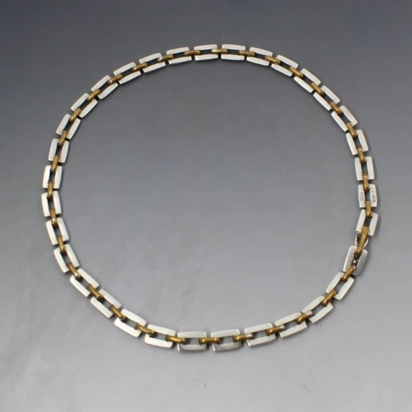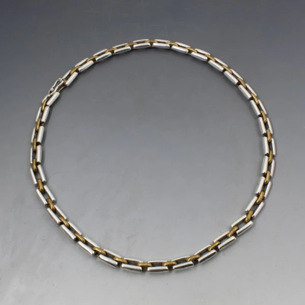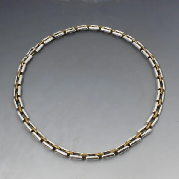 Beautiful vintage Mexico heavy sterling silver chain necklace. It has a mix of flat sterling silver and gold vermeil links. The chain measures approximately 46 cm (18 inches) x 0.8 cm and has a hook clasp closure with safety clasp. It is marked "TC-168 925" on the rear. Weight is 71 grams. They chain is in very good condition with small signs signs of wear commensurate with age.