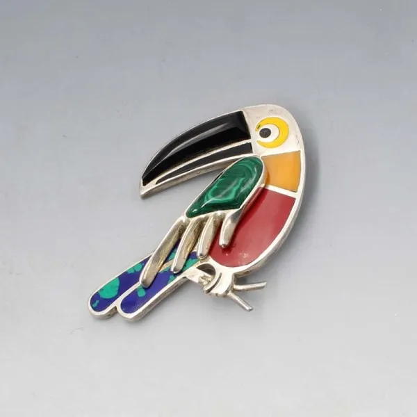 Beautiful large vintage Alicia De La Paz, Mexico,Taxco, solid 950 silver, malachite, black onyx, and enamel parrot booch. It measures approximately 6.3 x 4.1 cm. Weight is 27 grams.The rear of the brooch has a silver pin and rollover C clasp closure and is signed "TD 27 MEXICO 950". It is in very good condition.