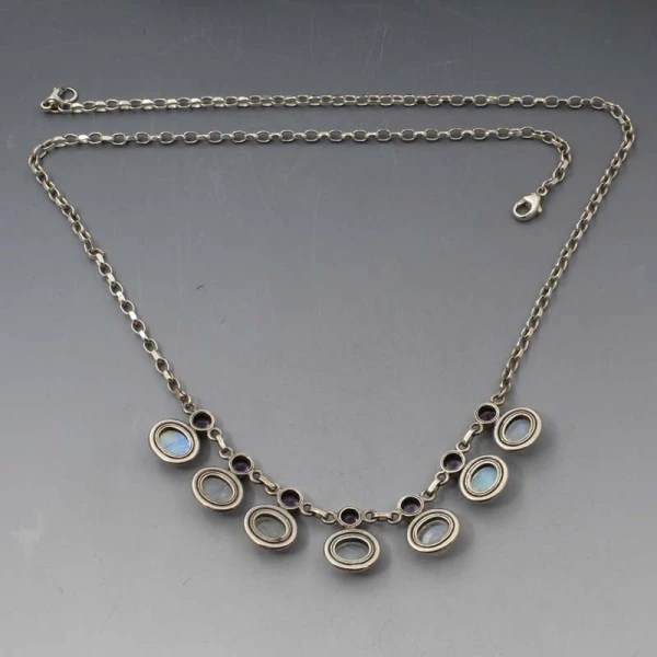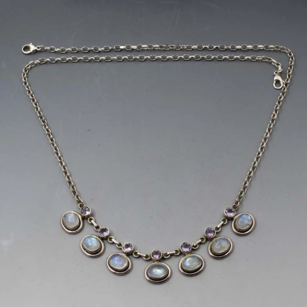 Stunning vintage moonstone amethyst and sterling silver necklace. The seven oval moonstone gems are bequtiful quality and are bezel set in openbacked sterling silver settings with small faceted amethyst gems above. The necklace has a sturdy solid sterling silver chain with a lobster class closure at each end allowing the necklace to be adjusted towhatever the desired length is. The necklace measures approximately 60 cm (24 inches) at full extension. Weight is 27.0 grams. It is in very good condition.