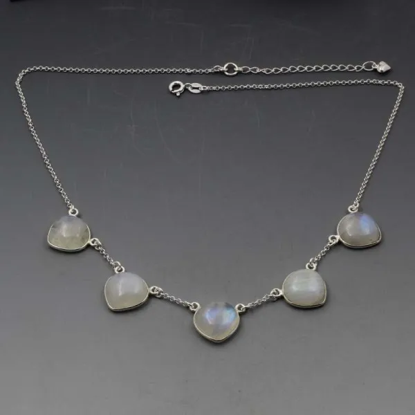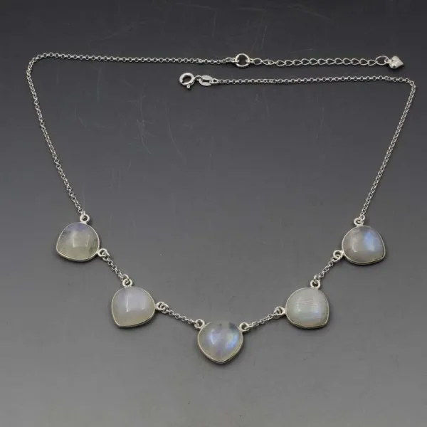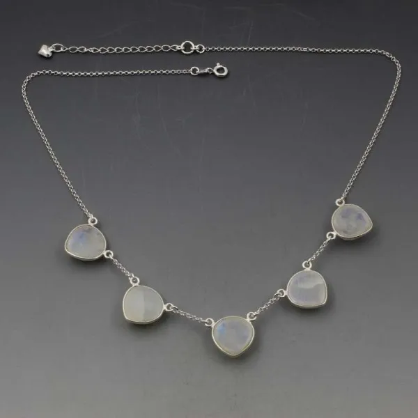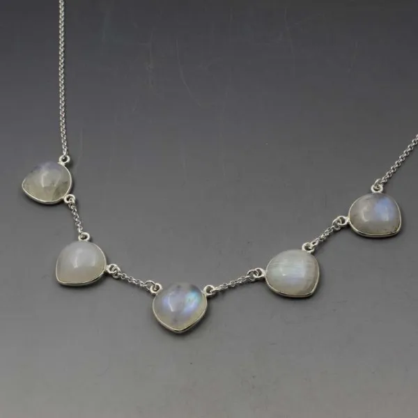 Beautiful moonstone and silver necklace. It has five solid moonstone cabochons bezel set in sterling silver settings on a sterling silver chain. Each moonstone cabochon measures approximately 1.4 x 1.4 cm. The necklace is adjustable between 43 cm to 48 cm (17 to 19 inches) and is finished with a small silver heart charm.