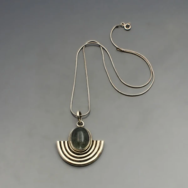 Vintage modernist moss agate and sterling silver pendant. The pendant measures approximately 3.2 x 3 cm and has a 40 cm (15.75 inch) sterling silver snake chain. Weight is 14 grams. It is marked "925" and is in very good condition with small signs of wear commensurate with age.