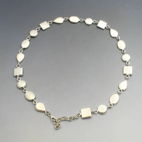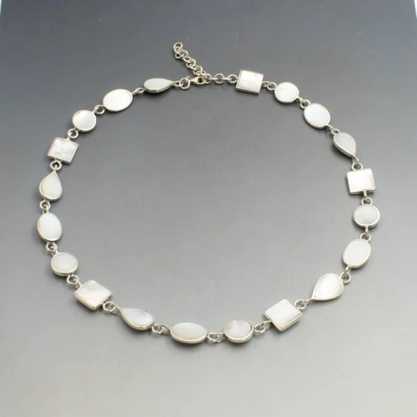 Vintage mother of pearl and silver necklace. The necklace has mixed shape mother of pearl and solid silver links with a silver lobster clasp closure.The necklace measures approximately 19 inches (48 cm) long x 1.1 cm wide (at the widest part). It is adjustable between 17 to 19 inches. Weight is 40 grams. It is is marked "925". It is in very good condition with small signs of wear commensurate with age. Condition: Very Good with small signs of wear commensurate with age. Colour/Sterling silver Size: 48 cm (19 inches) long x 1.1 cm wide. Weight: 40 grams Era: Estimated 1970's to 1990's