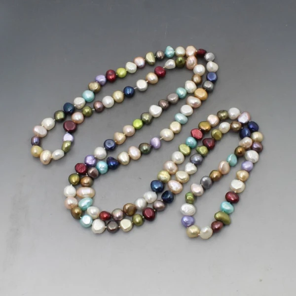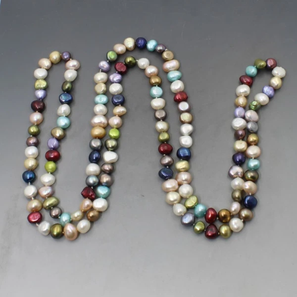 Vintage dyed freshwater pearl necklace. The dyed pearls are mixed colours including natural freshwater pearls. The necklace measures approximately 104 cm long (41 inches) and goes over the head.The pearls vary slightly in size with an average pearl measuring approximately 0.7 x 0.8 cm. Weight is 69 grams. It is in very good condition. Condition: Very Good Colour/Gemstone: Dyed freshwater pearls Metal: Size: Approximately 104 cm long (41 inches) Weight: 69 grams Era: