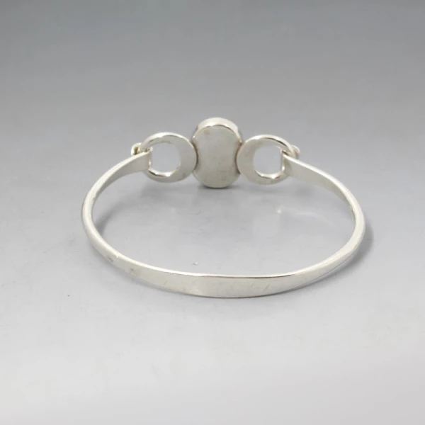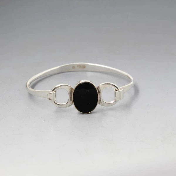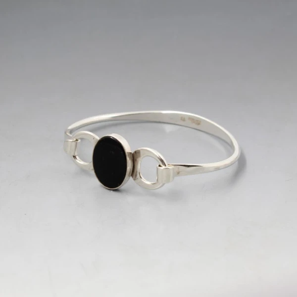 Vintage Ne From, Denmark, onyx and sterling silver bangle. The oval onyx gem is bezel set in a sterling silver setting. The bracelet is openable and the clear internal dimensions measure approximately 5.3 x 4.8 cm. Weight is 12 grams. It is marked "NE FROM 925S STERLING DANMARK" on the inner side. It is in very good condition.